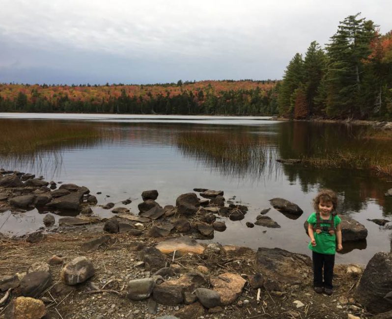 Our four year old, Nezzie, is eager to hit the trails and sleep in a hammock or tent. I tried before, when she was still three, for a foliage-rich trip to a lake in Amherst Community Forest. She wasn’t ready to sleep overnight in a tent relatively distant from home at that point, but she loved the hike, and she loved playing on the granite slabs common to Maine inland water.